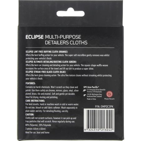 The Eclipse Microfibre Detailing Cloths 3pk offers versatility and high performance for a variety of detailing tasks. Ideal for car enthusiasts and professional detailers, these cloths are designed to handle multiple cleaning and polishing jobs with ease.